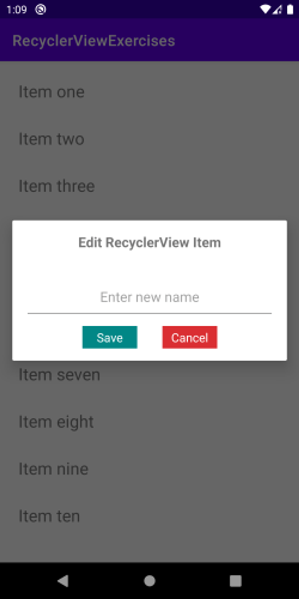 save.setOnClickListener { if (!TextUtils.isEmpty(itemNameEdit.text.toString())) { adapter.updateItem(position, itemNameEdit.text.toString()) dialog.dismiss() } else { Toast.makeText(this, "Please enter a new name", Toast.LENGTH_SHORT).show() } } cancel.setOnClickListener { dialog.dismiss() }